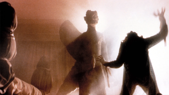 The other random bit of trivia about this movie are friggin’ insane. For starters, the director had the room refrigerated to as cold as -40F, so that the breath would be nice and steamy this required a $50k refrigeration unit (a quarter million bucks today), and it broke down all the time, so it took half a year to film the exorcism scene. There were plenty of injuries on set, including back injuries that both Ellen Burstyn and Linda Blair still suffered from throughout their adult life, a missing finger for a set designer, and a missing toe for another. Early in the filming a bird flew into the electrical system, causing a fire that burned down the set. A man acting in the radiology scene would be convicted of murdering a film reporter six years later. The director would frequently slap actors or fire a gun in the air to get the startled reaction he was looking for. The voice of possessed Reagan was played by a voice actress who achieved this sound by chain-smoking, swallowing raw eggs, and drinking whiskey (despite being a recovering alcoholic). What else… oh! The use of subliminal messaging inserted into the film to make it more scary. Sure, there’s that white scary face, but that’s not what I’m talking about. Various sounds would be layered into the sound effects, such as bees buzzing and actual pigs squealing as they’re slaughtered. Images of skulls would be superimposed into backgrounds, and a variety of words were superimposed and displayed for fractions of a second.