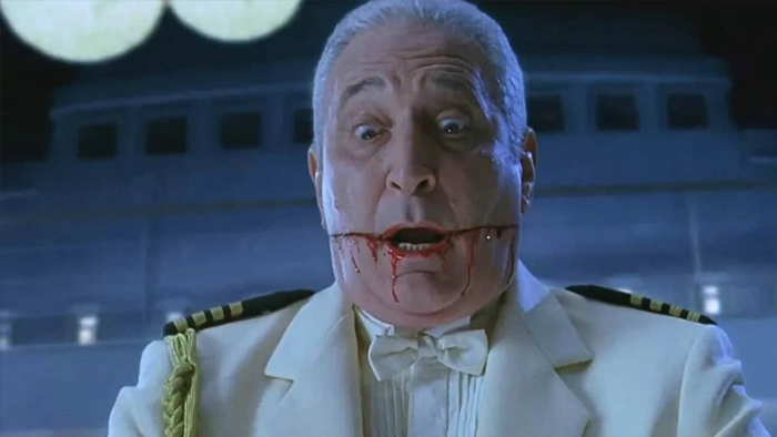 I think I have to go with the ballroom scene in 2002’s “Ghost Ship.” It’s a fairly forgettable movie – except for that one scene. Old-timey cruise ship has an everybody-dances scene on the deck of the ship. A young girl even has a dance with the captain himself. Then all of a sudden there’s a snap as a tight cable breaks loose and zings across the dance floor. Everybody more than 5 feet tall is suddenly motionless, their eyes a mask of surprise and horror. Still alive… until everyone’s upper part suddenly tumbles to the ground, followed by their lower parts – everyone sliced neatly in two. What a scene! The rest of the movie is, I dunno, a bunch of ghosts trying to kill anyone who comes on the ship? I honestly don’t remember the first thing about the movie, other than its notorious death scene.